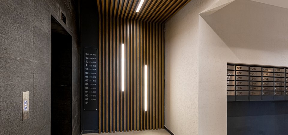 Отделка входных групп и межквартирных коридоров выполнена по индивидуальному проекту, связанному с архитектурной концепцией всего жилого комплекса.
