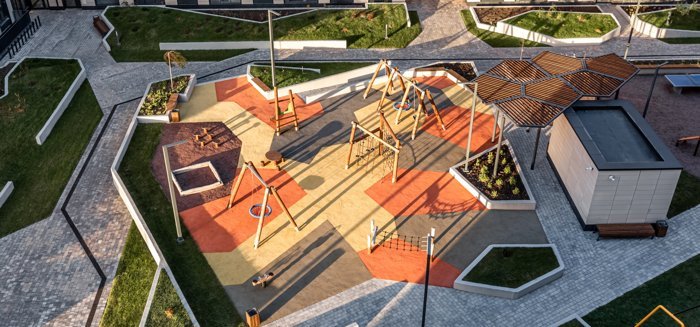 Ландшафтный дизайн квартала продуман до мелочей, большие газоны будут засажены специально подобранными злаковыми культурами и дикими травами, которые создадут впечатление постоянно цветущего поля. Высаженные деревья и кустарники дополнят пространство яркими зелёными акцентами.