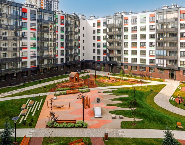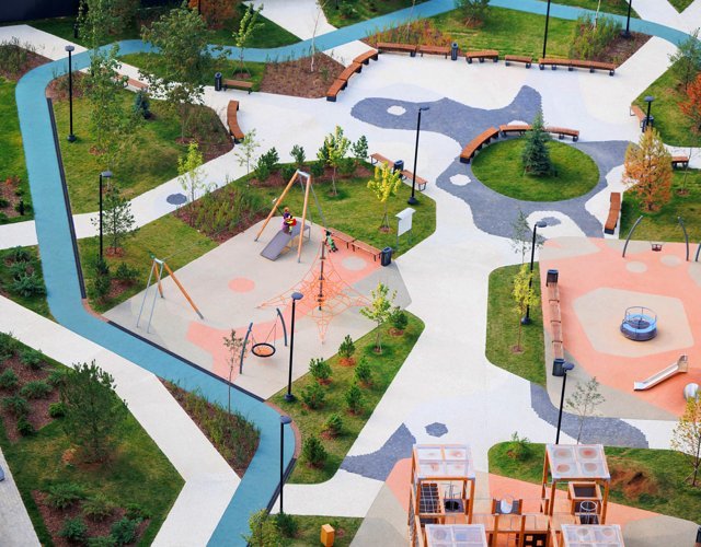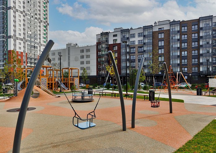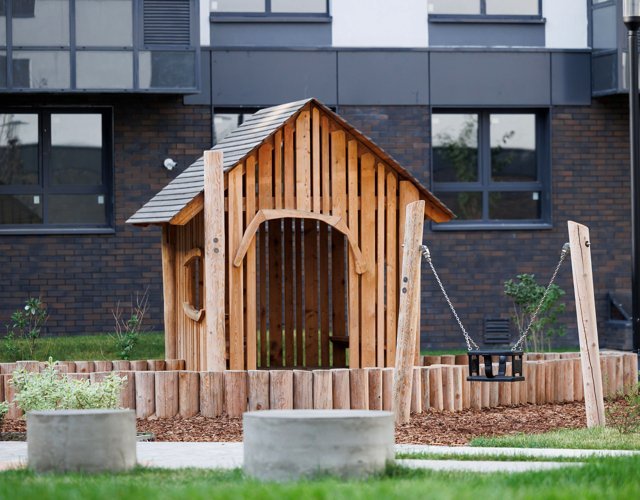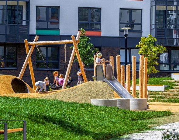 Для маленьких жителей «Оклы» во дворах оборудованы площадки с увлекательными элементами: канатные дорожки, зиплайны, стенки для скалолазанья, качели-гнезда, игровые полосы препятствий из цельной древесины и различные интерактивные элементы.