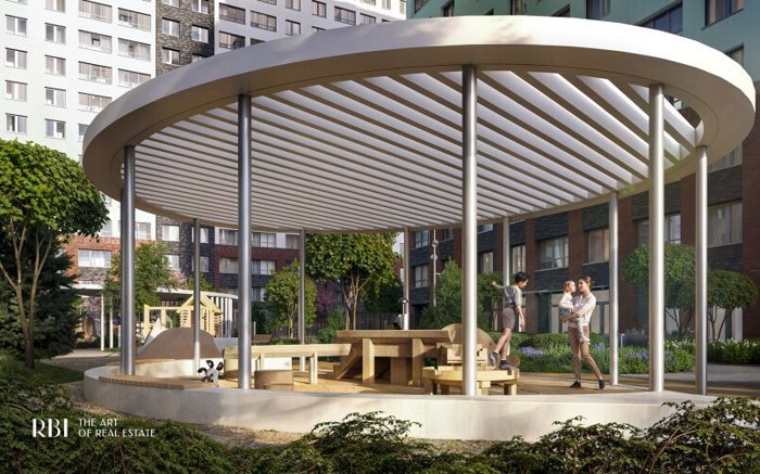 На территории — два приватных двора, разделенные аллеей с фруктовым садом, беседки и зоны отдыха, зоны для занятий йогой, коворкинг на открытом воздухе, спортивные и детские площадки. В комплексе также есть детская поликлиника.